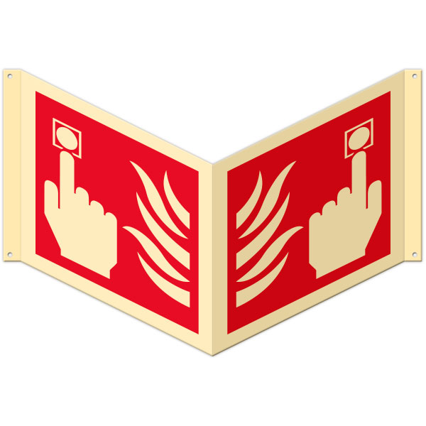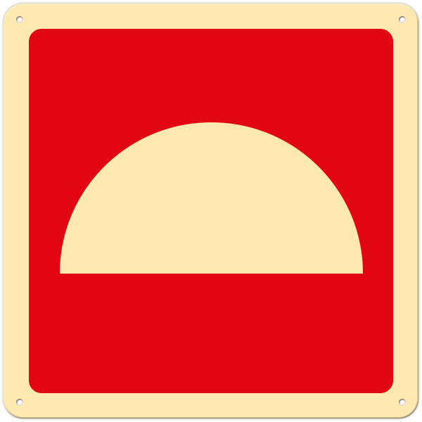 Skilt med symbol som markerer plassering av manuell utløserknapp for brannalarm. Trykket har fotoluminescerende pigmenter som lades opp i dagslys eller kunstig belysning, og vil deretter lyse i minst 60 minutter når det blir mørkt.