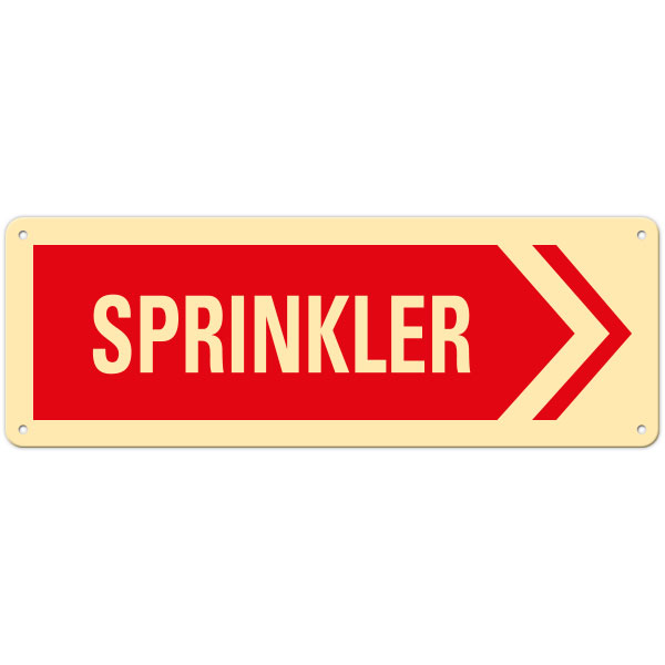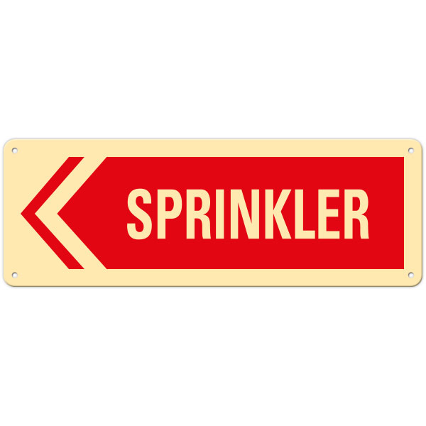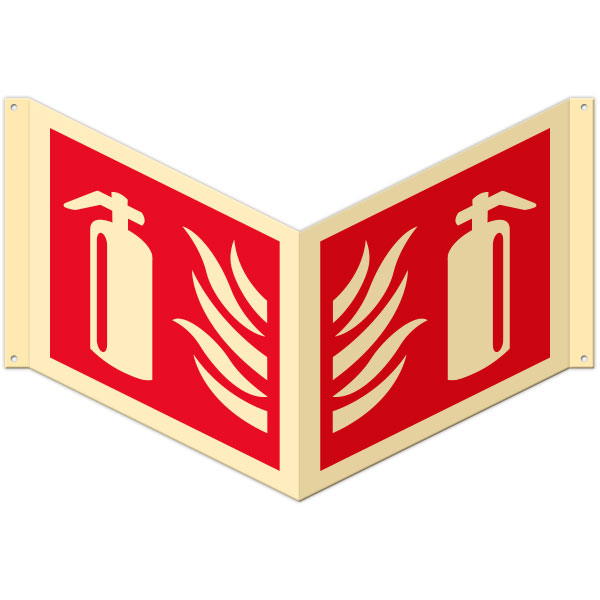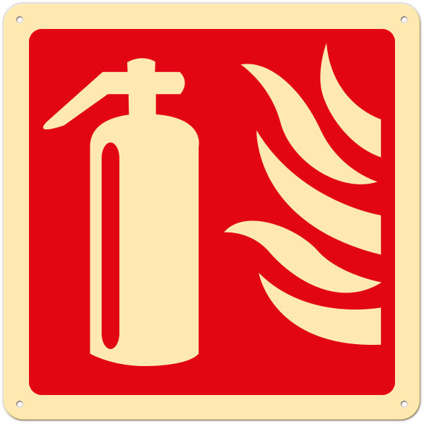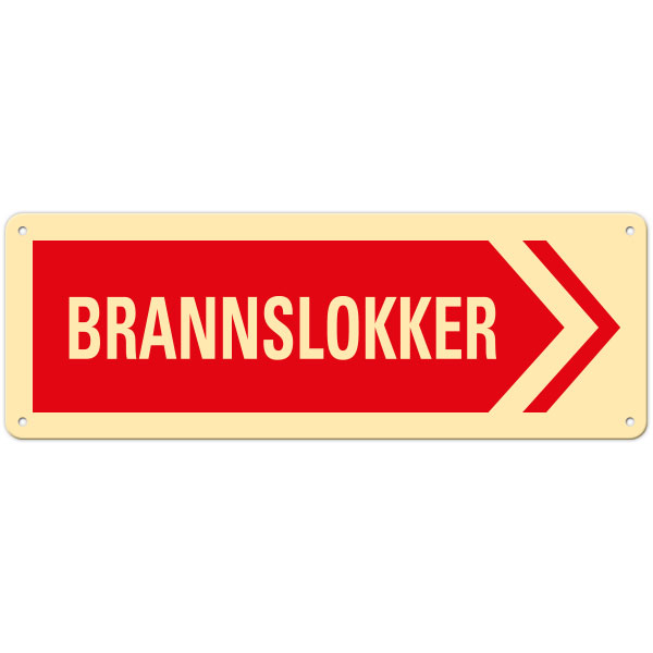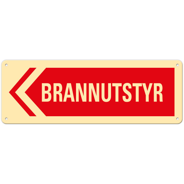 Skilt med tekst og pil som angir retning til brannslukker. Trykket har fotoluminescerende pigmenter som lades opp i dagslys eller kunstig belysning, og vil deretter lyse i minst 60 minutter når det blir mørkt.