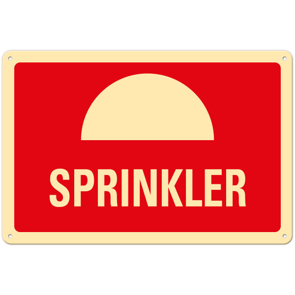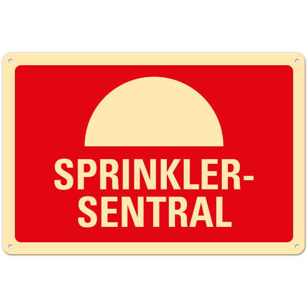 Skilt med symbol og tekst som markerer plassering av stoppventil for sprinkler. Trykket har fotoluminescerende pigmenter som lades opp i dagslys eller kunstig belysning, og vil deretter lyse i minst 60 minutter når det blir mørkt.