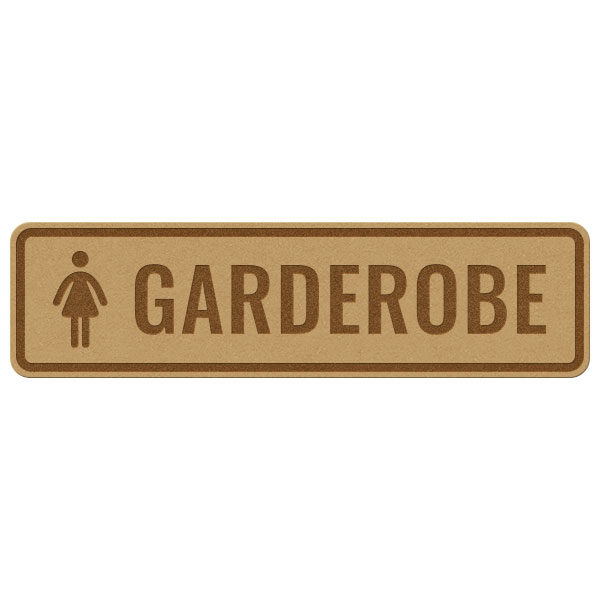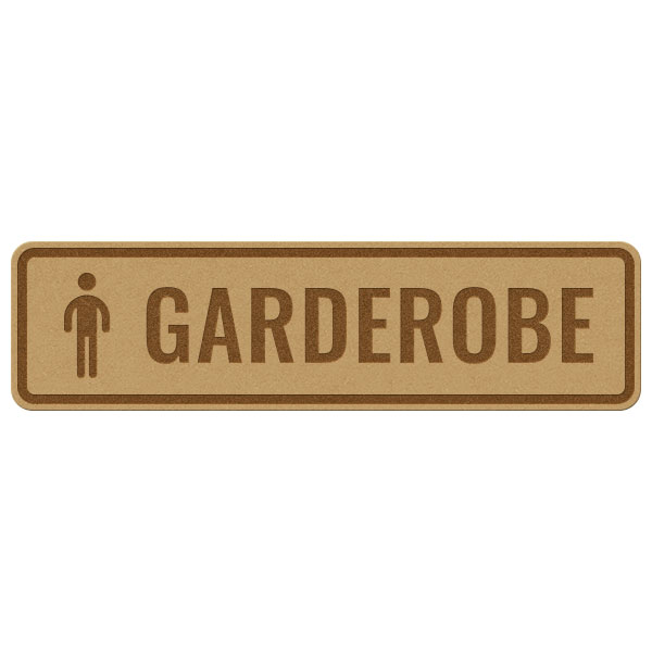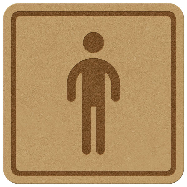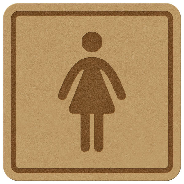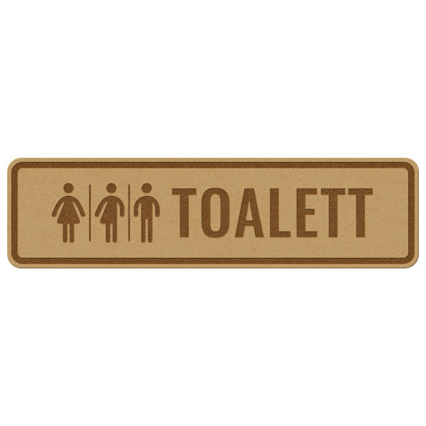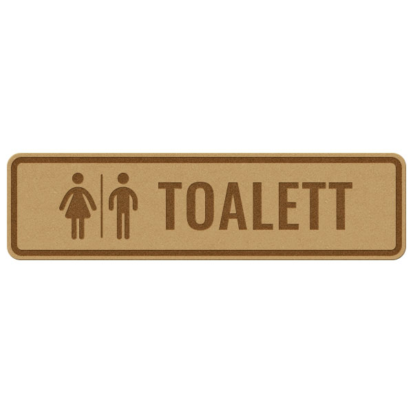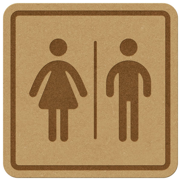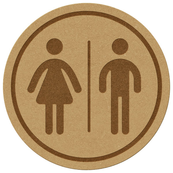 Skilt med symbol for toalett tilegnet damer, herrer og transkjønnede. Laget av laserskjært og lasergravert MDF‑plate. For innendørs bruk.