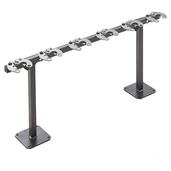 Veggmontert sykkeloppheng med plass for opptil 6 sykler fordelt på 2 høyder, slik at styrene ikke treffer hverandre. Rammeverket består av rektangulære 20/40 mm rør i galvanisert stål med en godstykkelse på 2 mm. Selve sykkelkrokene er belagt med plast for å unngå riper på syklene. Opphenget er i tillegg utstyrt med ringer ved hver krok som gjør det mulig å låse syklenene med vanlige sykkellåser.