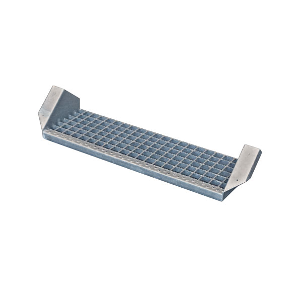 Robust trappetrinn i varmgalvanisert stål med antisklistruktur og uten vanger slik at det kan monteres med valgfri helningsgrad. Trinnet har skruehull på sidene for enkel montering.